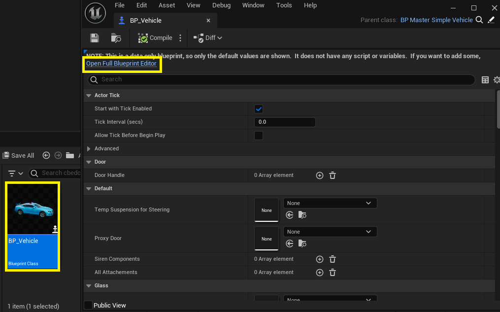 All the vehicle physics can be changed from the vehicle blueprint. To do this, double click the “BP_Vehicle” to open the blueprint editor. Once open, click on the “Open Full Blueprint Editor” link at the top.