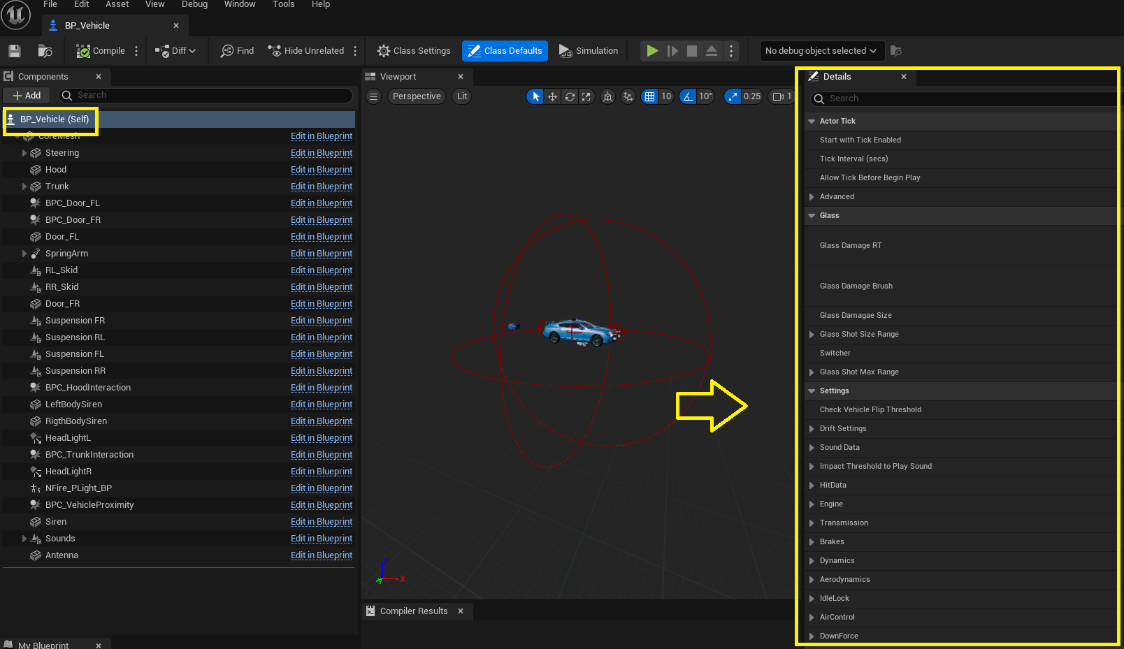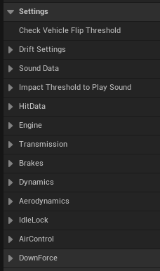 On the components section on the left, select “BP_Vehicle (self)” and the details window will show a set of configuration that can be changed. In the “Details” tab search for the “settings” section and expand it, this are the main configurations for the vehicle physics as well as for sounds configuration.