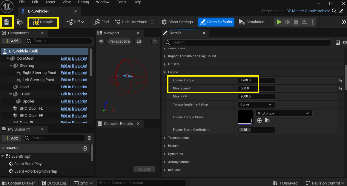 Go to the “Engine” section and expand it, set the “Engine Torque” value from 600 to 1200 and the max speed from 300 to 600. Then on the top left click the “Compile” button and then the “Save” buttons.