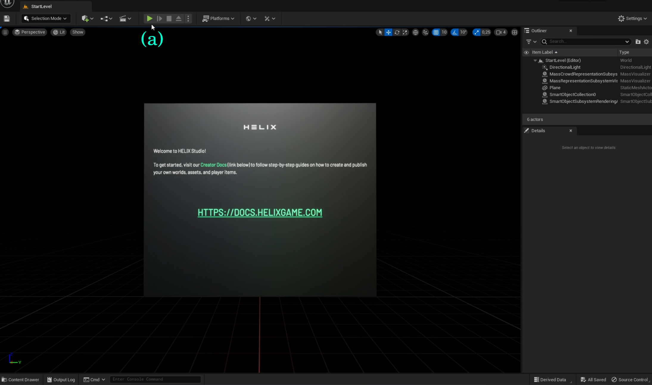 You will see a welcome Message and the StartLevel main tab. Check the Introduction for more details on the Tools and Structure of HELIX Studio.