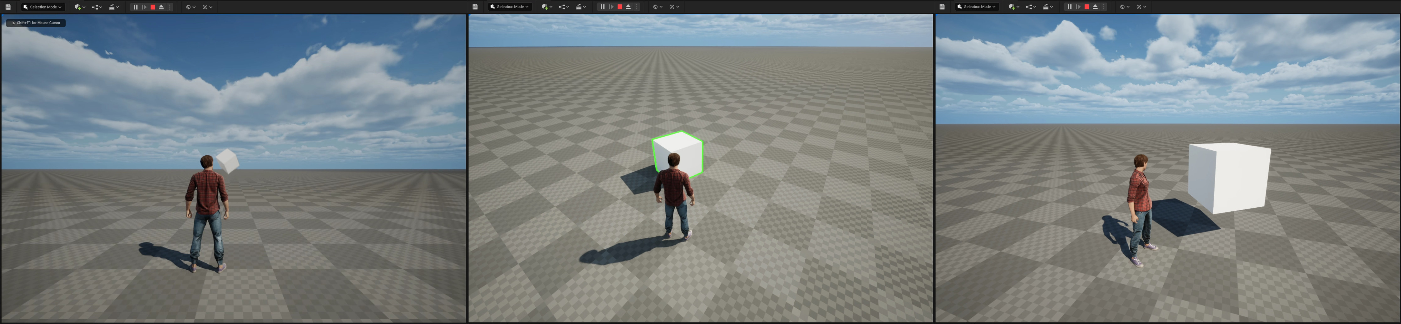 You will now see your Avatar and a white cube falling from the sky in front of the avatar. Run around and explore, the cube can be grabbed. If you move the Avatar close to it, you can pick it up with the E key and carry around.