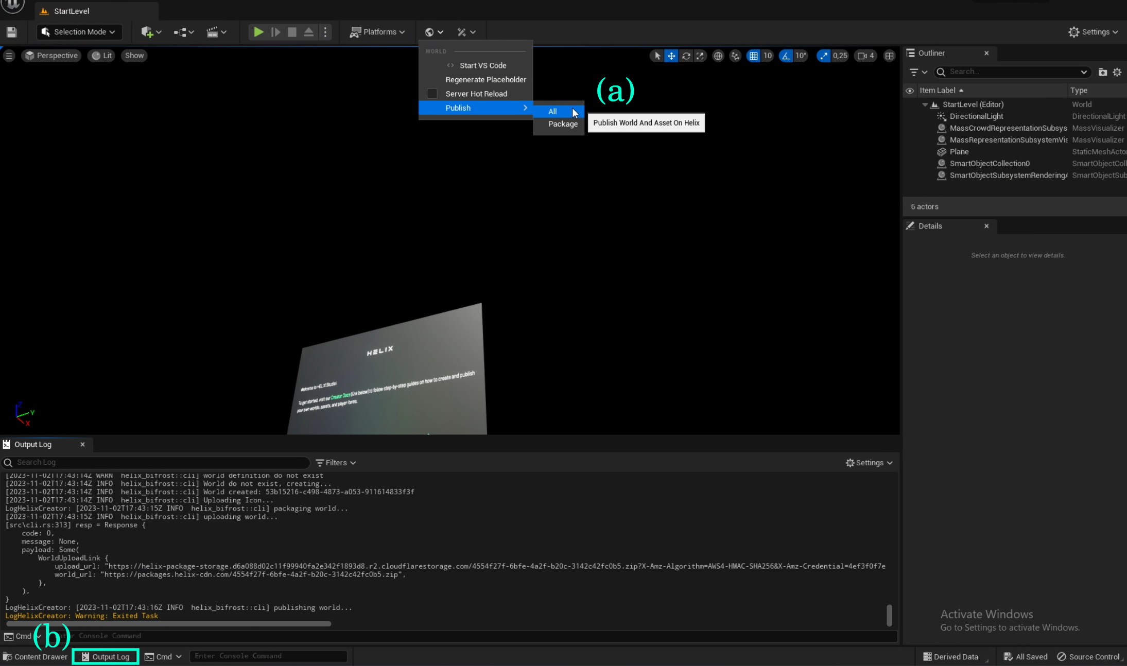 You see confirmation on the bottom right side and also in the Output log. (b)