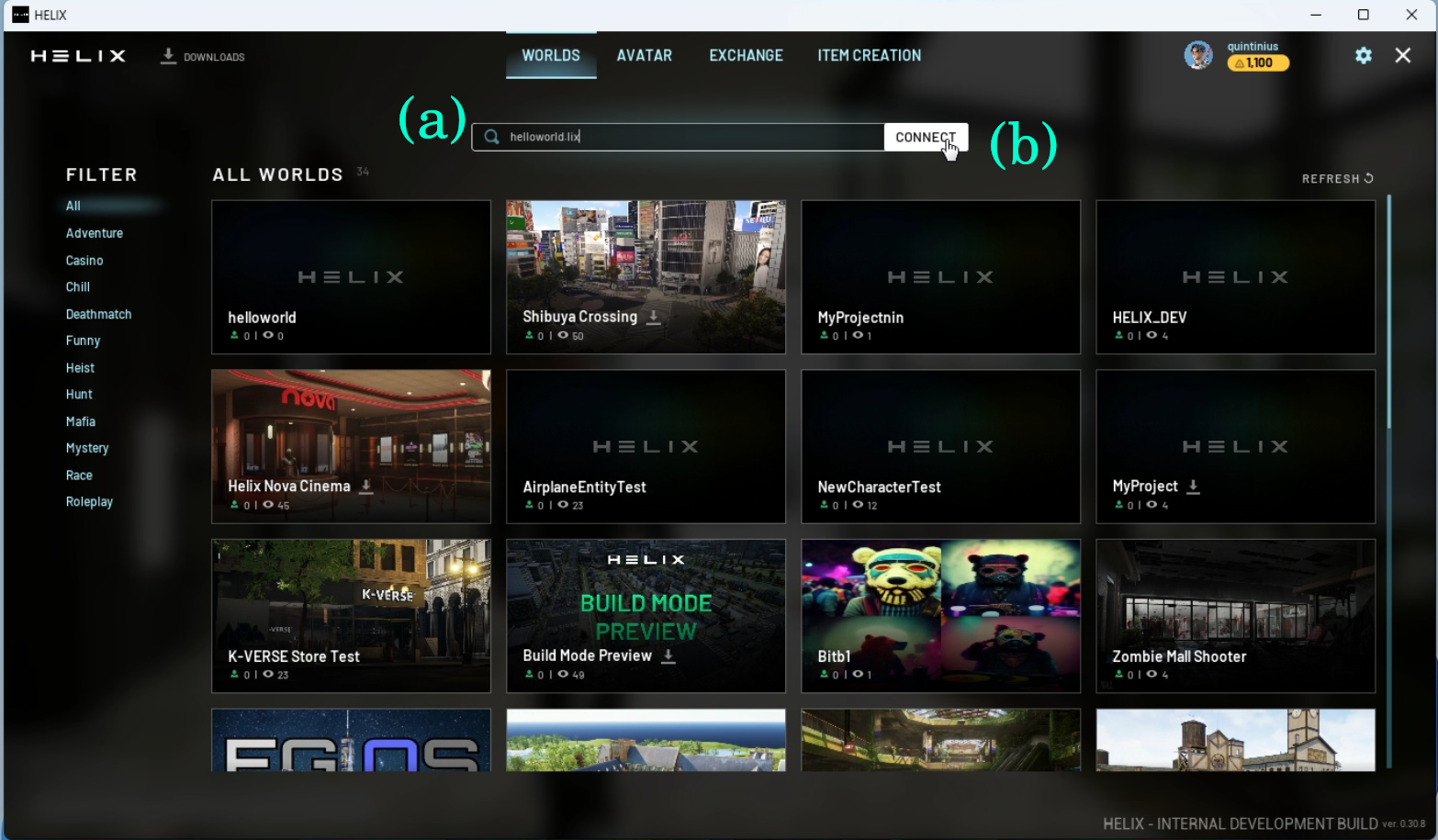 Your world should now be public and playable. In the example, the world can be found via helixgame.com/worlds/helloworld.lix and you can connect to the server via HELIX Client.