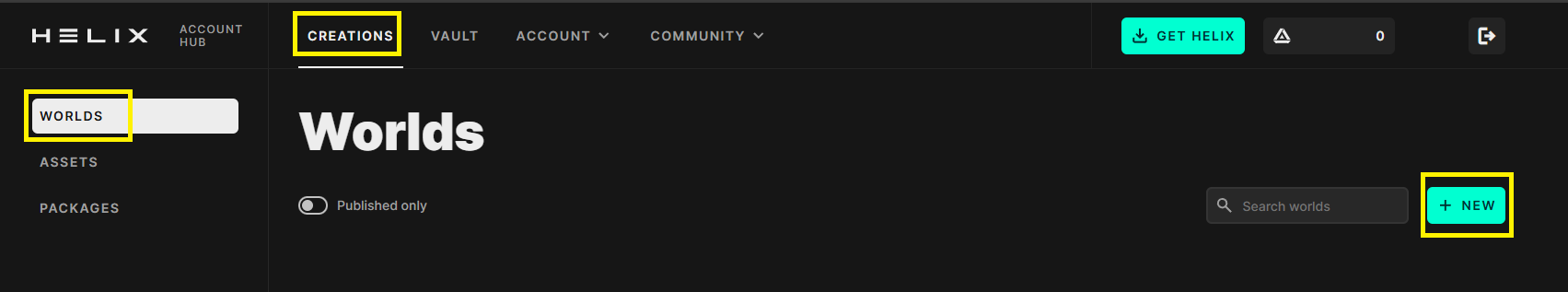To use HELIX database to store game components, a world has to be created in HUB. Go to CREATIONS -> WORLDS -> NEW