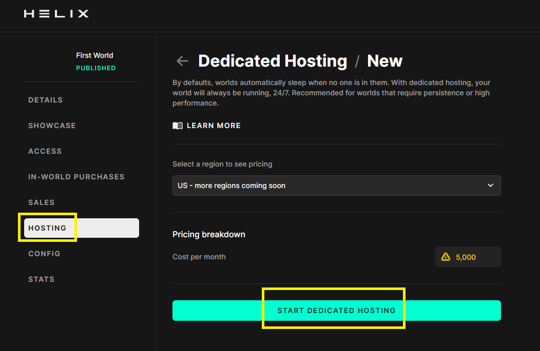 Fill the required information and then go to HOSTING from the left options and click on START DEDICATED HOSTING button and a dialog box with more options will be displayed.