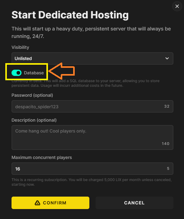 In the next form, select the visibility of the server, a password, a description and set the max number of concurrent players but the most important is to activate the button next to Database as this will create a database inside the world allowing to save game information. Click on CONFIRM to continue.
