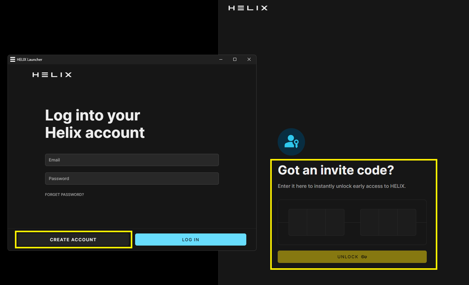 Click on "CREATE ACCOUNT" and a new window will open where an invitation code can be used to register into the HELIX plataform