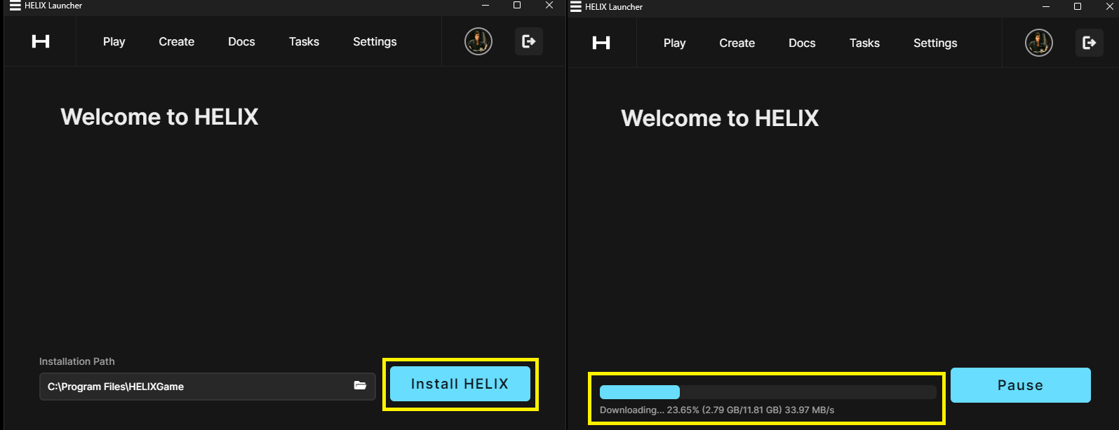 After the login, the Play tab will display the "Install HELIX" button with a default location. It is recommended to leave the defaults and click on "Install HELIX".