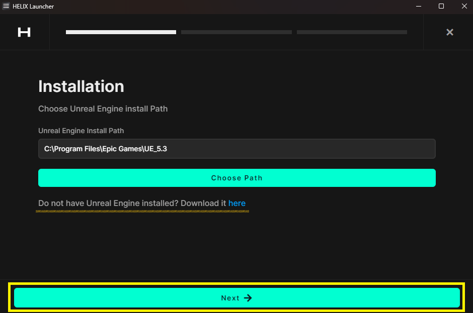 📝 Note: Prior to install HELIX Studio, the Unreal Engine must be installed first. In this page there is detailed information on how to install Unreal Engine 5.3.x or you can follow the link provided in the Launcher to install UnrealEngine directly.