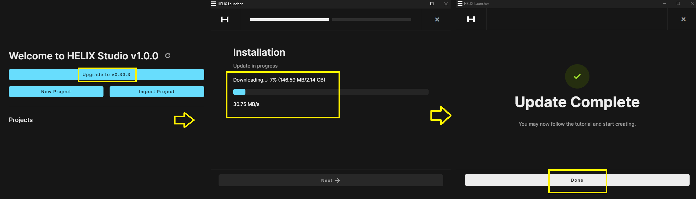 Click on "Done" to go back to the Create Tab and now if a new Studio version exist a button will appear. It is recommended to always update to the latest HELIX Studio version.
