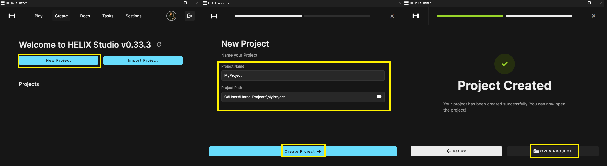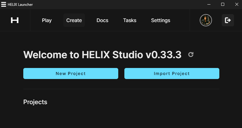 In the Settings tab, there are options to uninstall the HELIX Client or Studio in case a clean install is desired. Also, all projects can be cleared from the projects list in the Create tab, note that the project files will still remain on disk. The Development section is to access other versions from HELIX Client but it requires a Dev Channel Key, this is not required for most users.