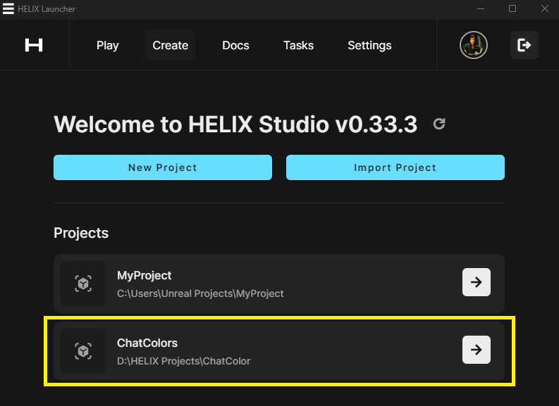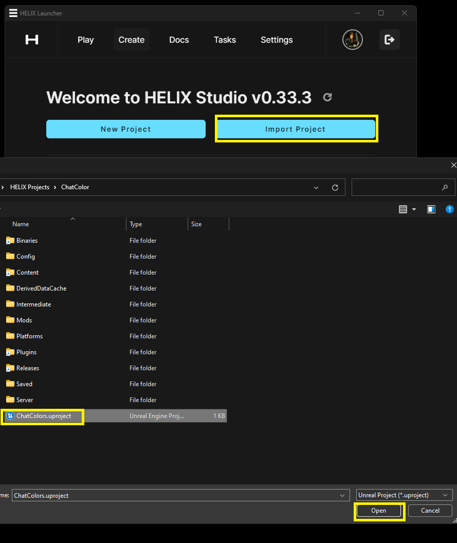 Studio projects can be imported into HELIX launcher by clicking on "Import Project" and navigating to the location where the project is and select the .uproject file and clicking on "Open"