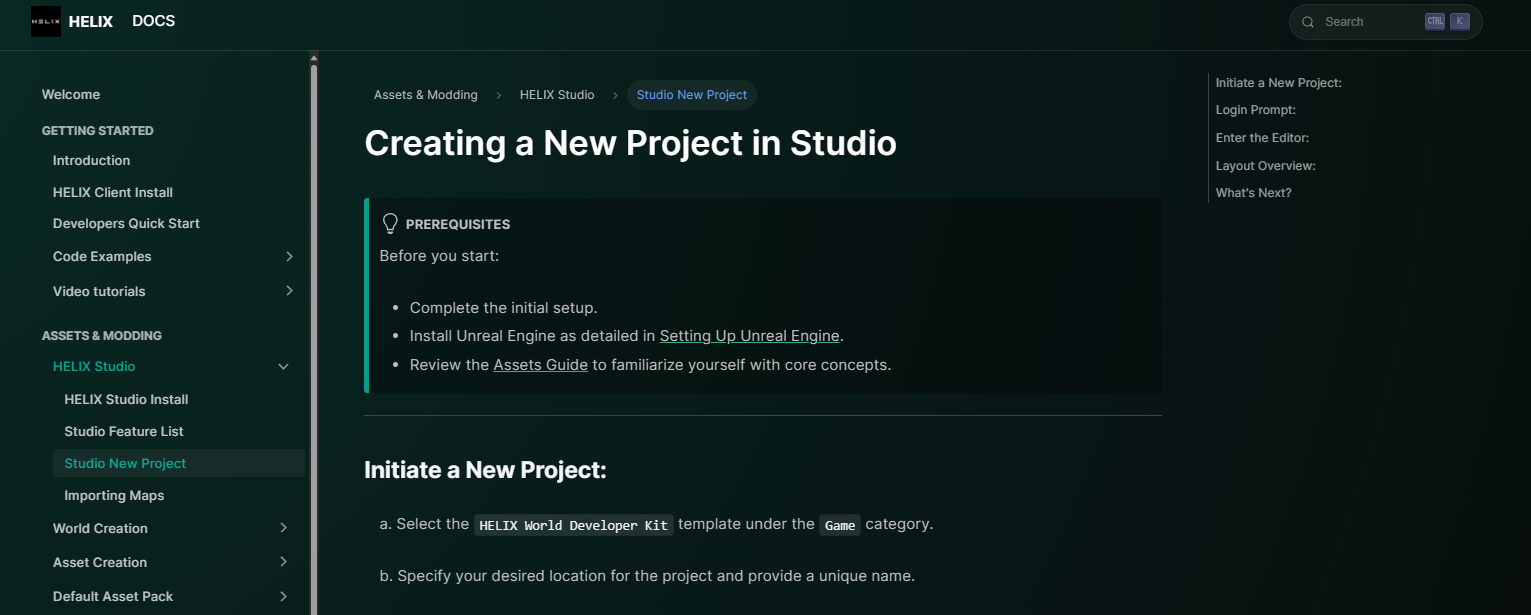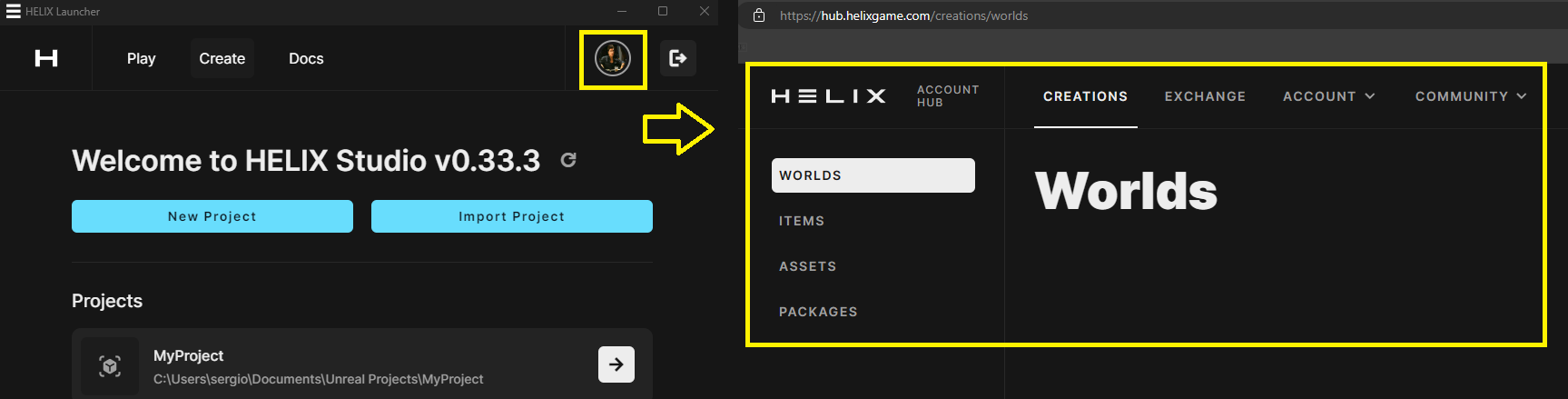 When clicking for the first time on the Create tab, a message will be displayed to install HELIX Studio. Helix Studio is the unreal plugin to create assets, items or worlds that can then be uploaded to HELIX hub