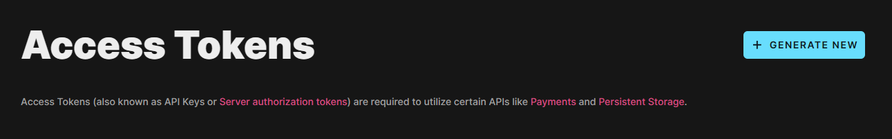 In the Access Token page, click on + GENERATE NEW to open the Create Access Token dialog box