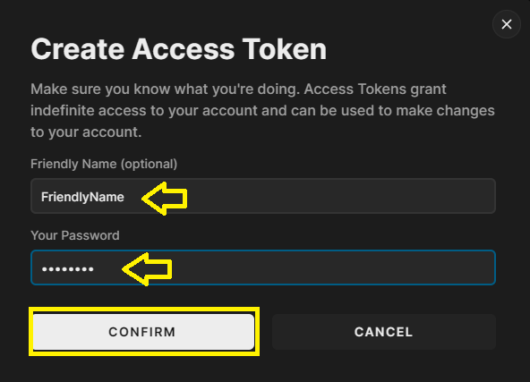 Add a friendly name for the token and write your password (the same password used to login into HELIX) then click on "CONFIRM"